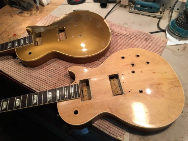 1969 Gibson Les Paul Deluxe Goldtop restoration. Chiseled out with hand to fit humbuckers, the gold was scraped away too. The mission was a complete restoration of the top.